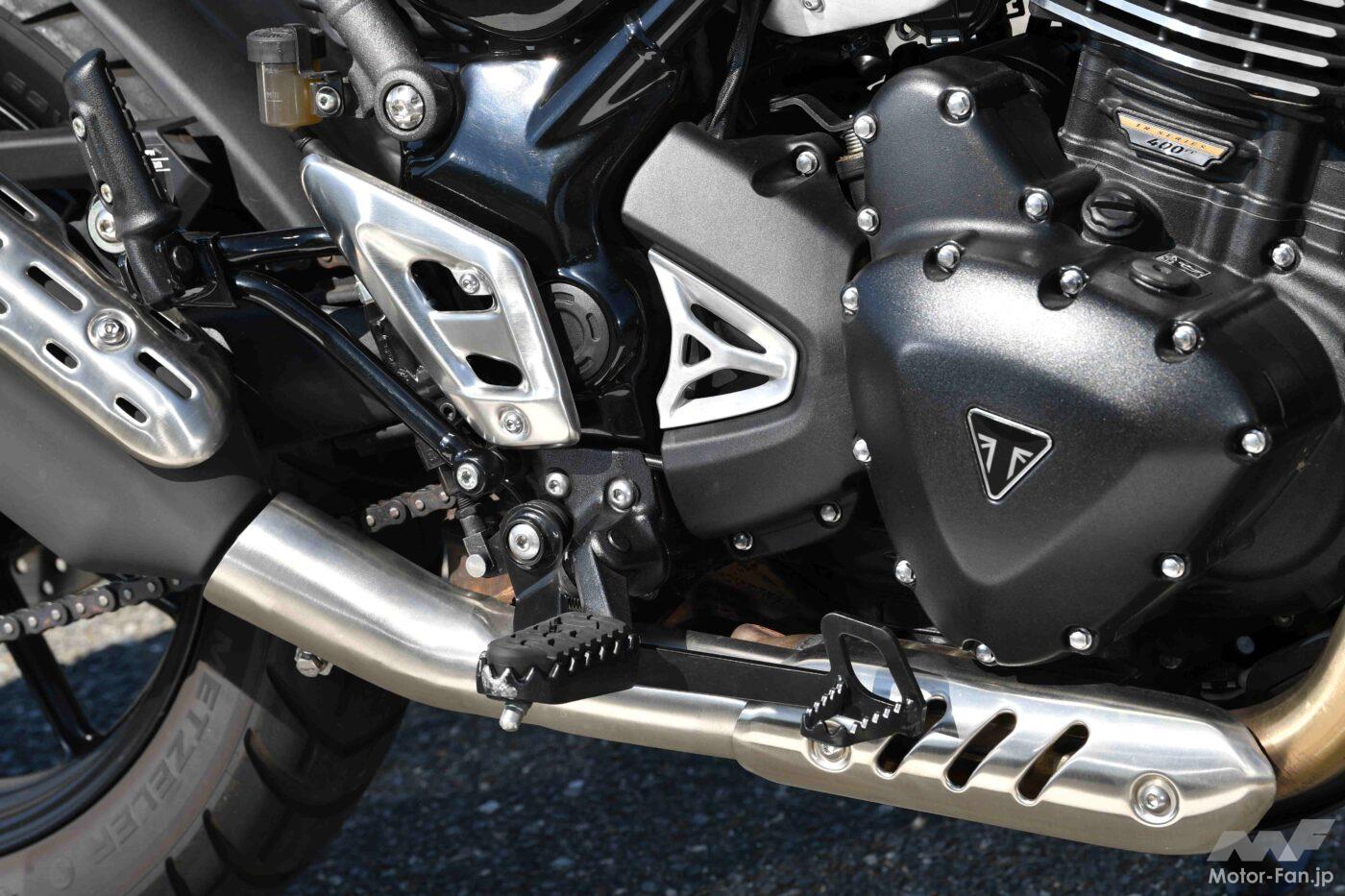 マウントブラケットやヒールプレートはスピード400と共通でも、ステップはオフロード車然とした構成。付け根が下方かつ前方にオフセットしているバーは、ラバーを取り外すとグリップ重視のギザギザ仕様になる。