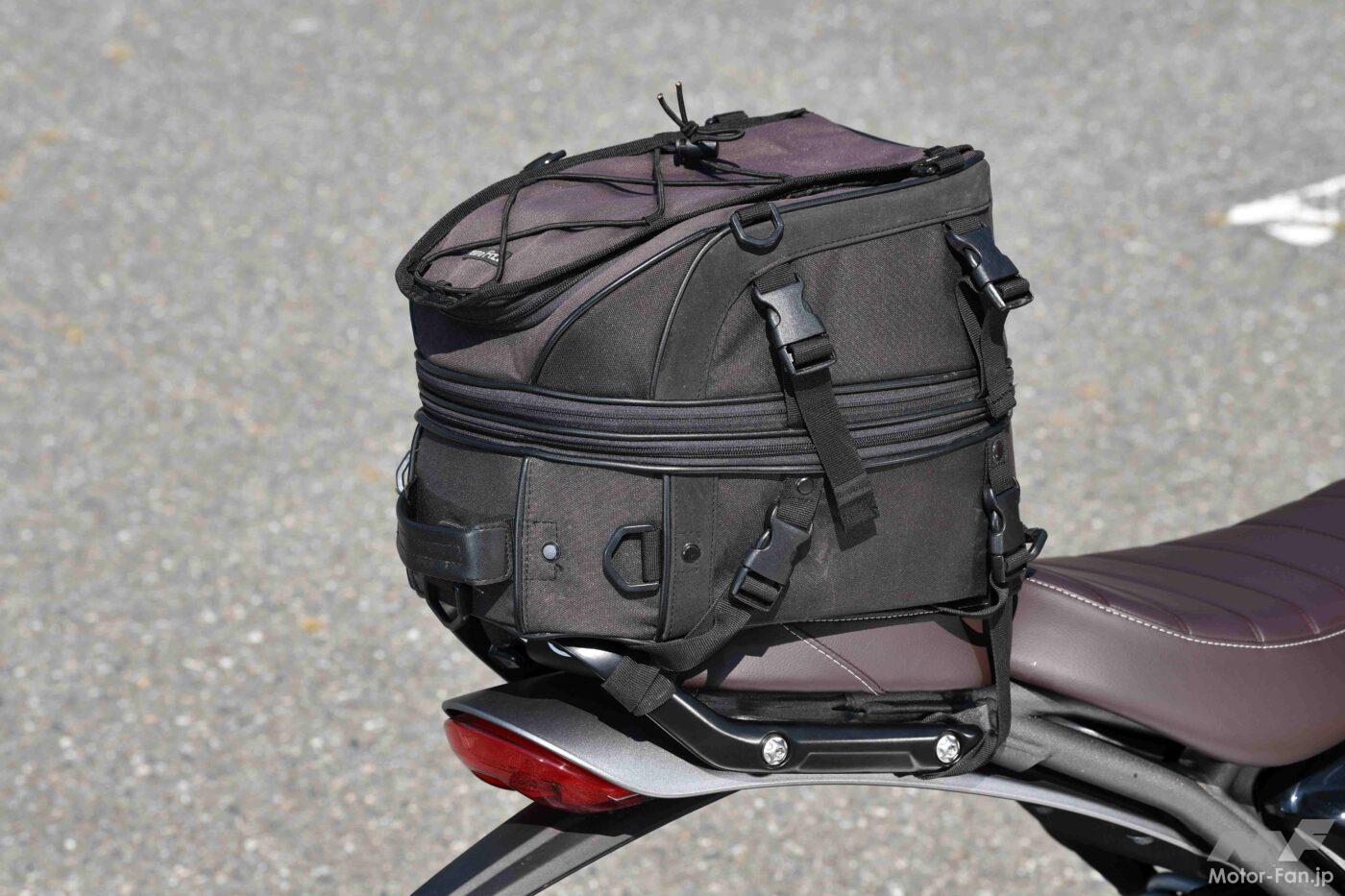 グラブバーにフックは備わっていないし、タンデムシート下左右のグラブバーとテールカウルのクリアランスは結構タイト。とはいえ、タンデムシートの座面が広くて平らなので、筆者の私物であるタナックスのダブルデッキシートバッグを装着した際の安定感は良好だった。タンデムシート下のスペースはわずかだが、写真を見ればわかるように、ETCユニットはギリギリで収納可能。
