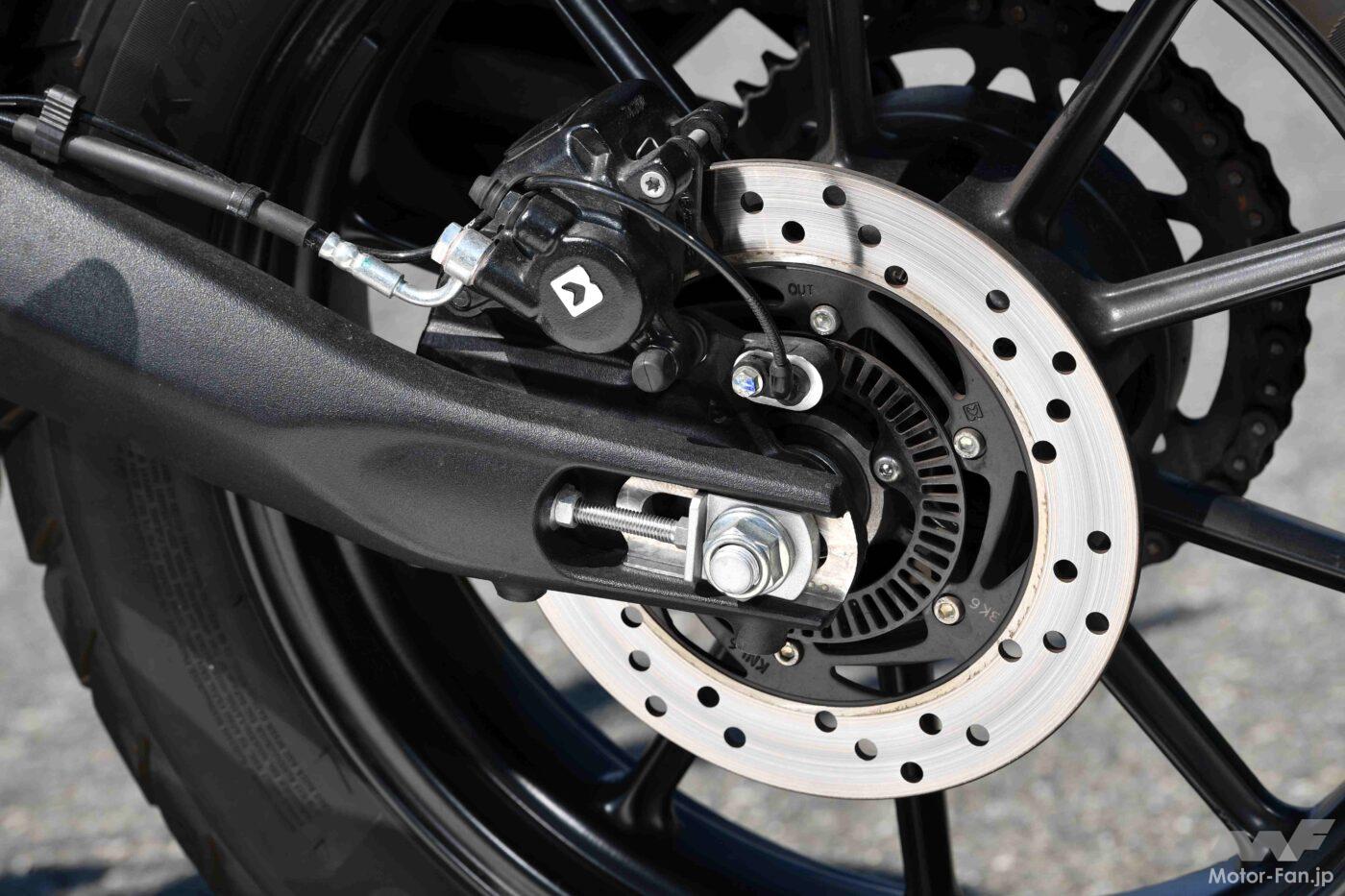 前後ショックはショーワ製で、φ43mm倒立式フロントフォークはビッグピストンタイプ、リアショックはリザーバータンク付きのRSU。前後150mmのホイールトラベルを確保しているだけあって、スピード400を含めた一般的なオンロードバイクと比べると乗り心地は良好。もっとも同業者の中には、リアサスが柔らかすぎと言う人がいて、そういう場合はリアショックのプリロードを強くすれば問題が解決できるらしい(初期設定は最弱)。