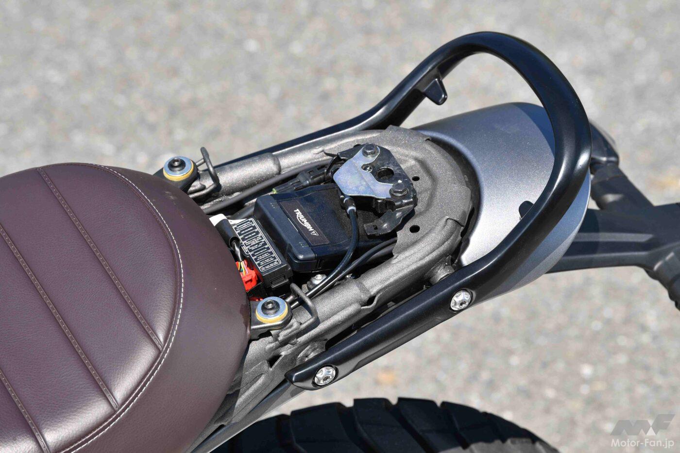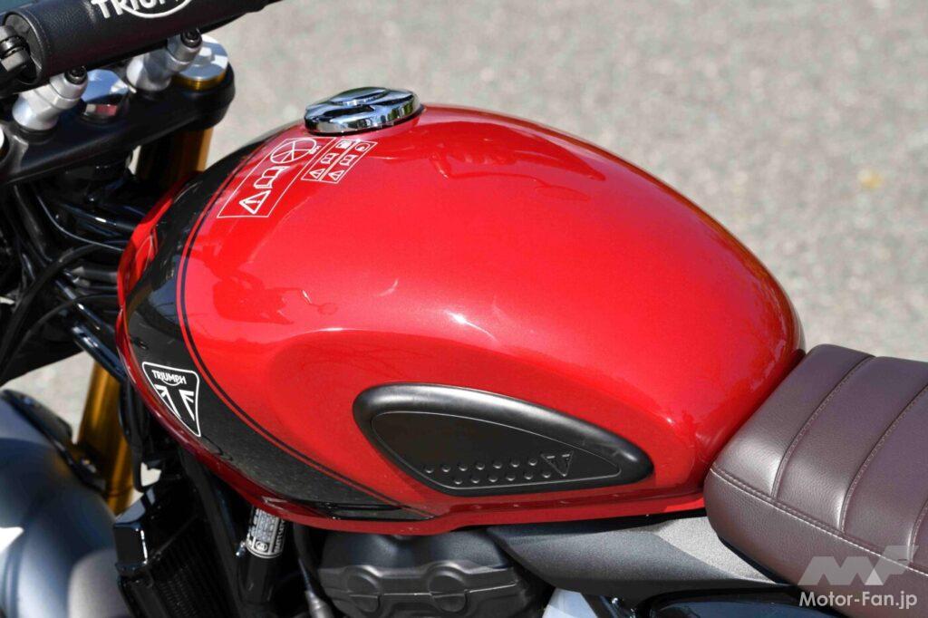 燃料タンクはトライアンフのモダンクラシックシリーズ全車に通じるデザインで、ライダーのヒザと接する面にはニーグリップラバーを装備。シートは前後分割式だが(スピード400は前後一体式)、タンデム用の下部には電装系部品が設置されているので、気軽にシングル仕様にできるわけではない。なおメインシート後端には傾斜がついているものの、着座位置の自由度はきっちり確保。