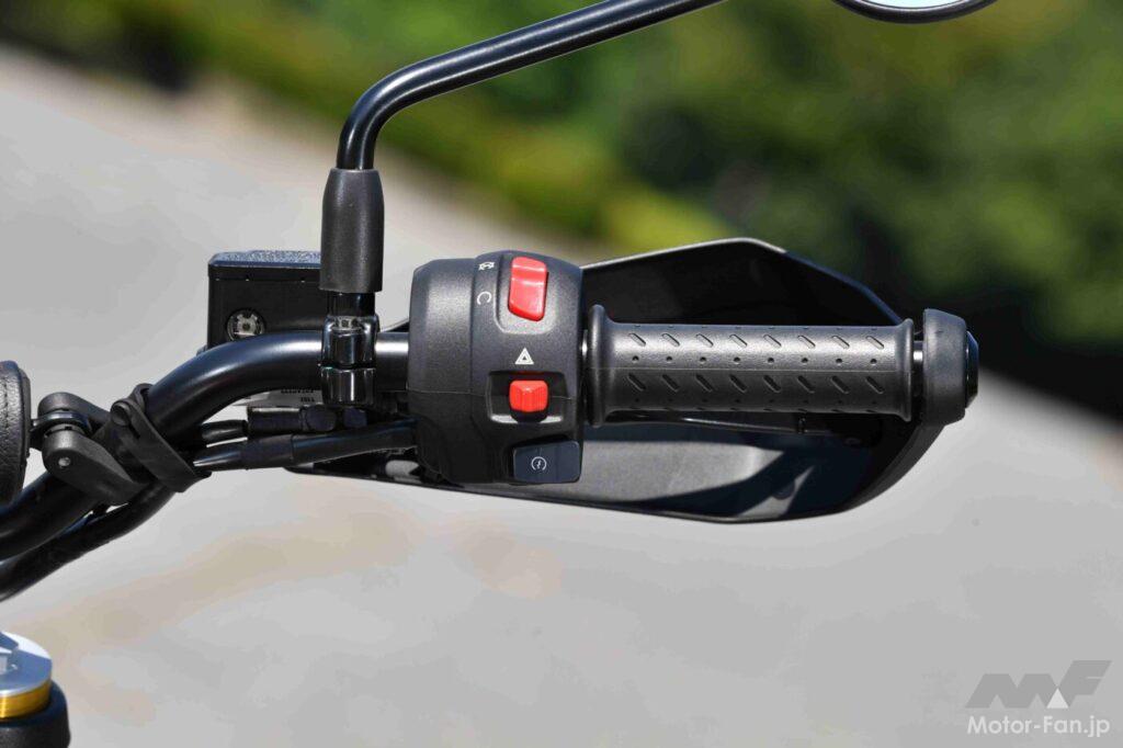 シンプルなデザインの左右スイッチボックスも、おそらく400cc単気筒車用の新規開発品。トラコンやABSの設定も含めて、メーターの液晶画面に表示される内容の変更は、すべて左のiボタンで行う。