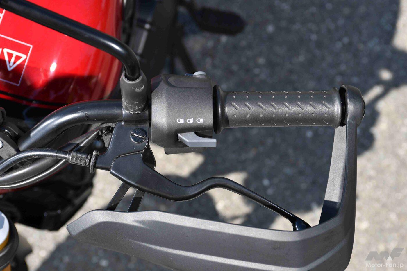 ブレーキ/クラッチレバーに位置調整機構はナシ。グリップラバーはオフロードタイプではなく、他のトライアンフも使用する同社の汎用タイプ。スロットルは、400ccクラスではまだ貴重な電子制御式。