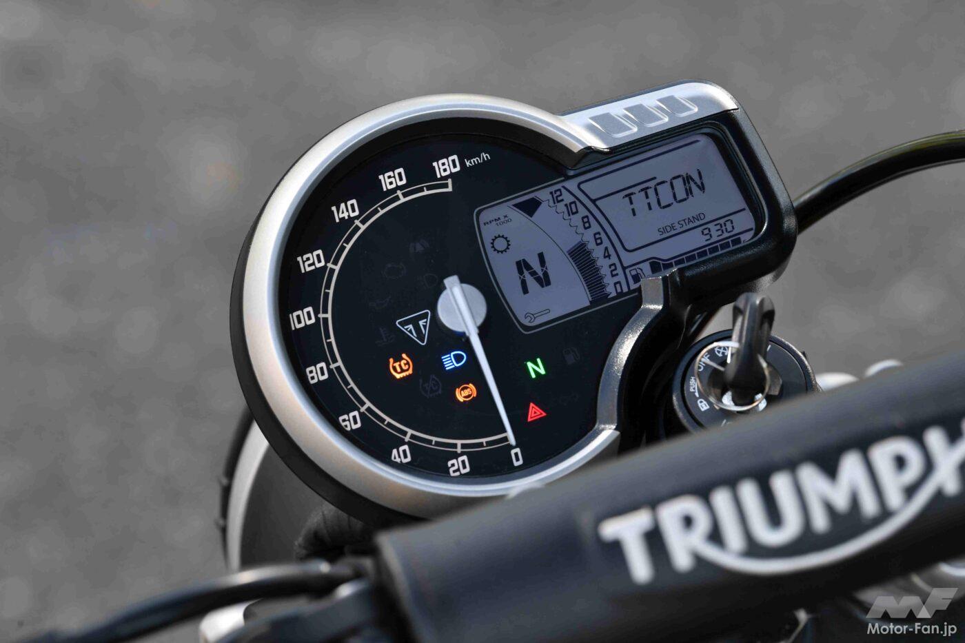 標準装備のバーパッドとナックルガードの効果で、コクピットはワイルドな雰囲気。テーパータイプのハンドルバーの幅は、兄貴分に当たるスクランブラー900/1200より広い約900mm(スピード400は約815mm)。新規開発のメーターは一昔前の並列3気筒車用に通じる構成だが、指針表示をエンジン回転数→速度に変更し、液晶画面を小型化。ギアポジションの右に表示されるバーグラフ式タコメーターは、目盛りが細かすぎるため、視認性はいまひとつ。
