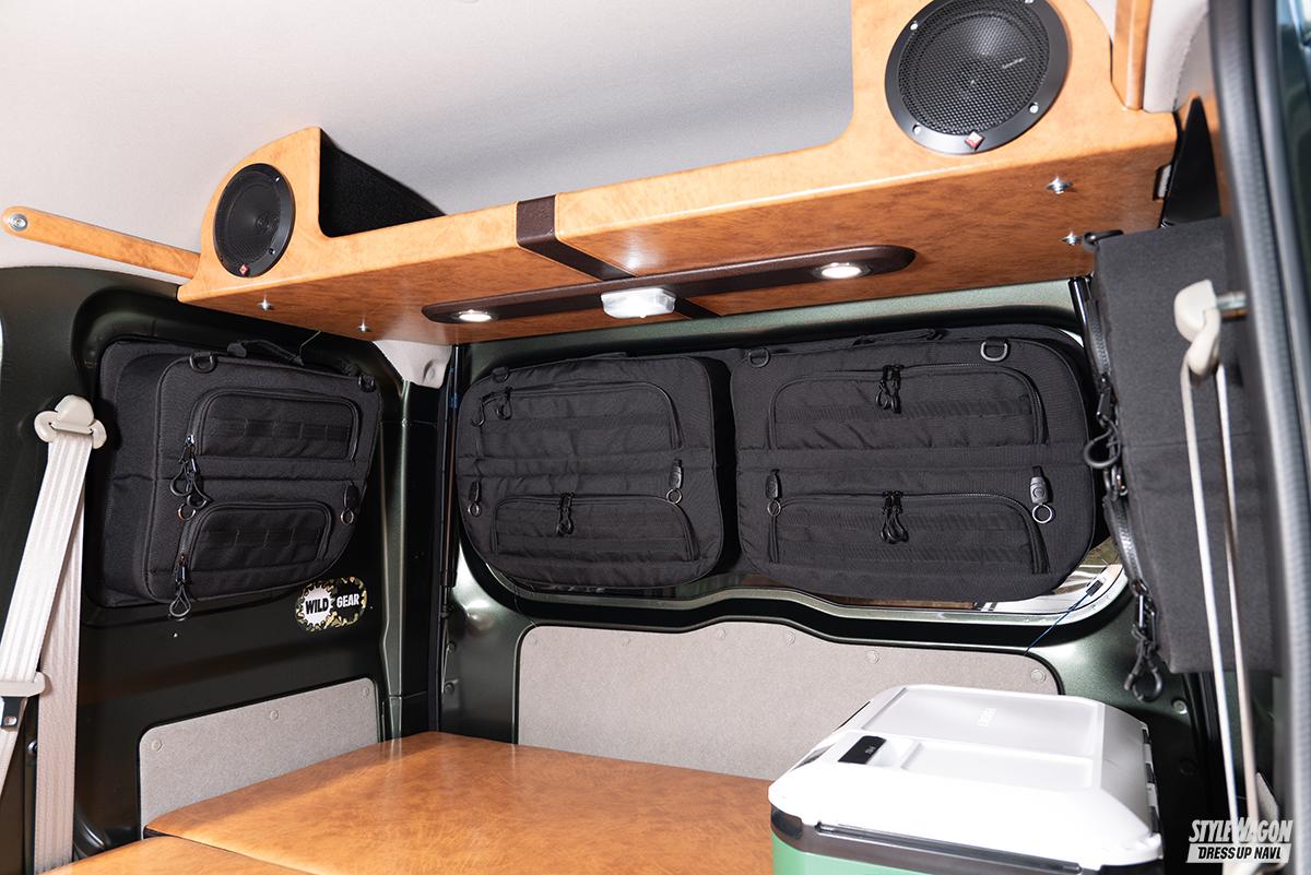 ワイルドギアのベッドキットは、軽量で頑丈なアルミ製フレームに、自分好みに仕上げられるオリジナルプリント(柄やカラーはオーダー可)のマットを採用。大人2人が余裕で就寝できるスペースを確保している。さらにオプションでルーフテントやサイド及びリアのウインドウ(車内側)に吸盤で装着できるウインドウ用ラゲッジ(バッグ)も用意。目的に合わせて様々な仕様に仕上げることが可能となっている。