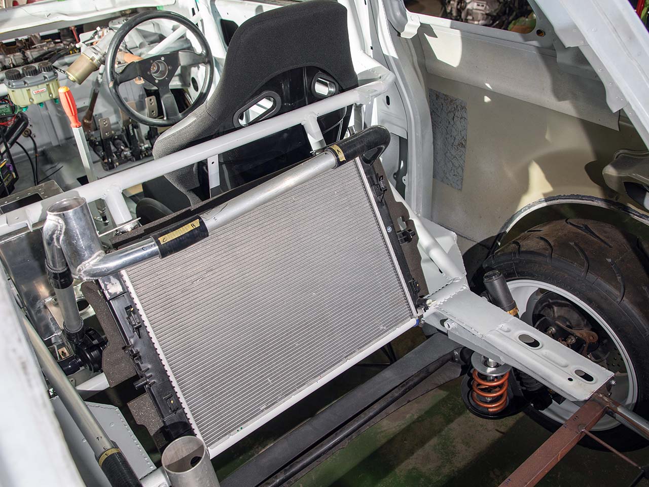 ラジエターはリヤに移設。これにより、エンジンルーム内のスペース確保と熱対策、そして荷重バランスの改善を同時に実現している。
