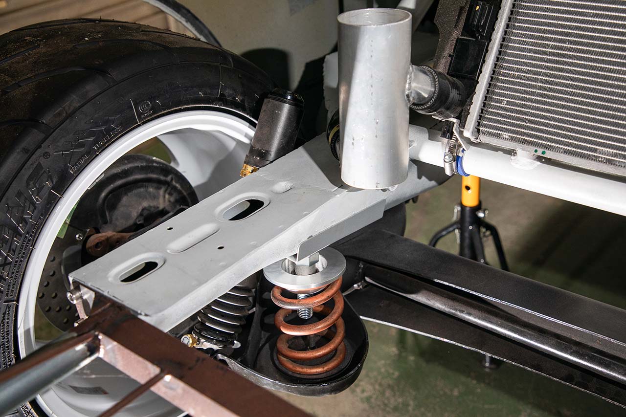 リヤサスペンションを支えるフレームも新設計。HKSのVIITSサスペンションを上下逆に組み込み、寝かせすぎて機能しにくいというアバルト特有の弱点を克服した。さらにスプリングブラケットを加工してID65スプリング対応とし、セッティングの自由度を大幅に向上させた。