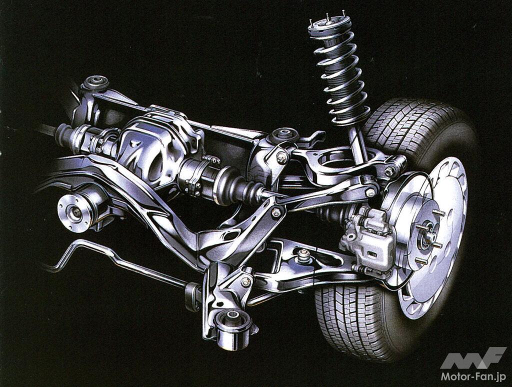 簡単にいうと、ダブルウィッシュボーンでいうアッパー、ロワの上下1対で構成されるAアームのアッパー側を、マルチリンクはフロントアッパーリンクとリヤアッパーリンクに分断し、ロワ側Aアームのスラント配置との効果で後輪の対地キャンバー変化の抑制を徹底するという考え方だ。