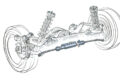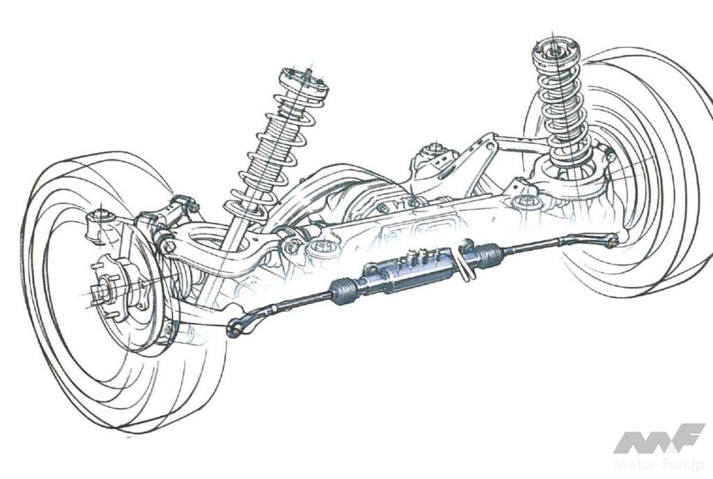 後輪は前輪舵角と車速にもとづき、ディファレンシャルギヤケース後ろにある油圧パワーシリンダーから生えたタイロッドで後輪を最大1°、同位相側に操舵する。