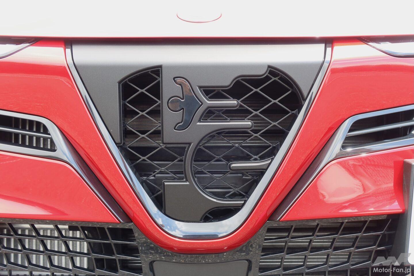 目を引くといえば、内外の随所に配された人間をくわえた大蛇、あるいは大蛇と赤十字の組み合わせもそう。ドアを開けるとダッシュボードの側面にアルファロメオを象徴するソレがあり、アルカンターラのシートにはヘッドレスト部に赤々としたトレードマークがあって、リヤドアを開けようとドアハンドルに目をやれば、その隣にも大蛇+人間。空調吹き出し口の中心、スマホのワイヤレス充電パッド、ダッシュボード上面にも大蛇+人間、もしくはそれに赤十字が組み合わさった紋章があしらわれている。アルファロメオに好意的であればあるほど、うれしい仕掛けだろう(筆者はうれしい)。