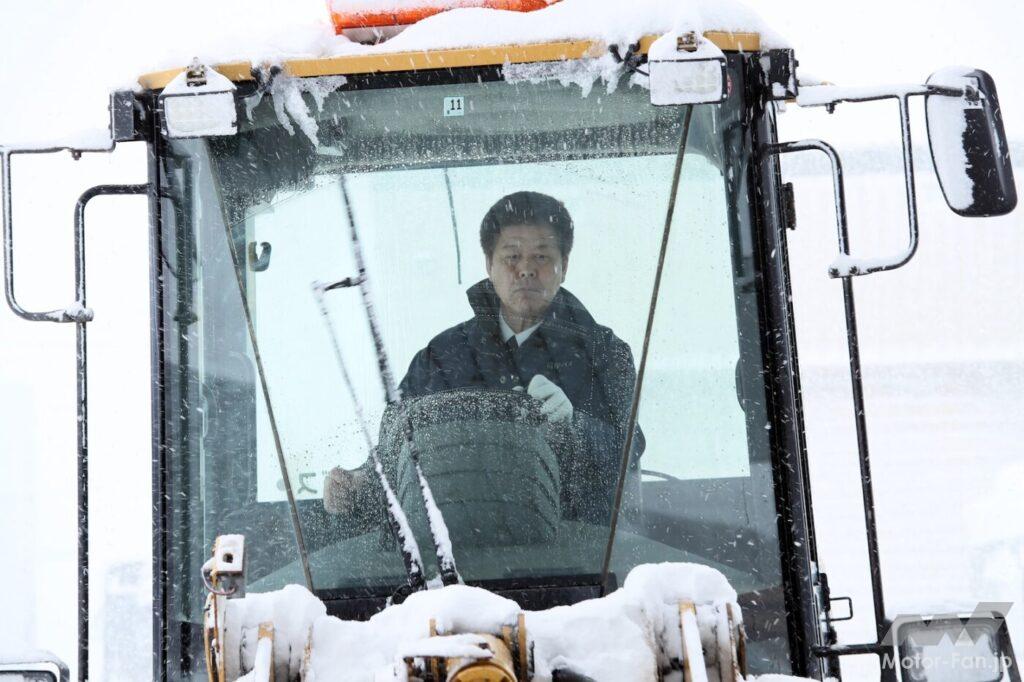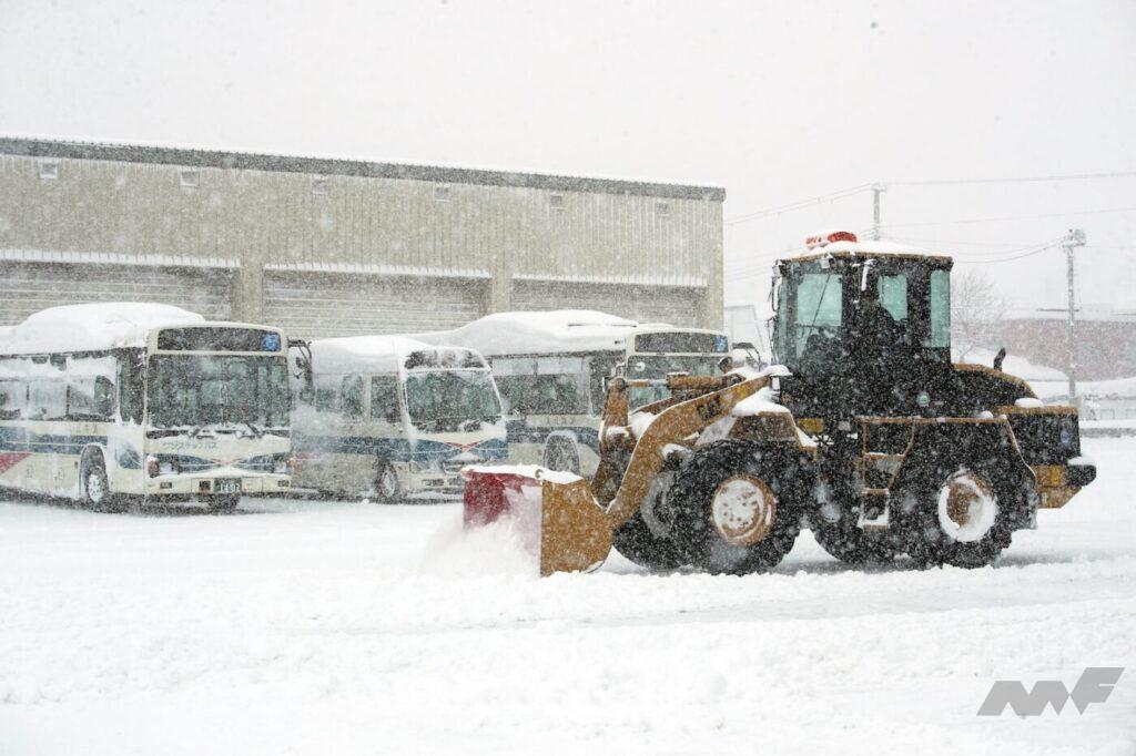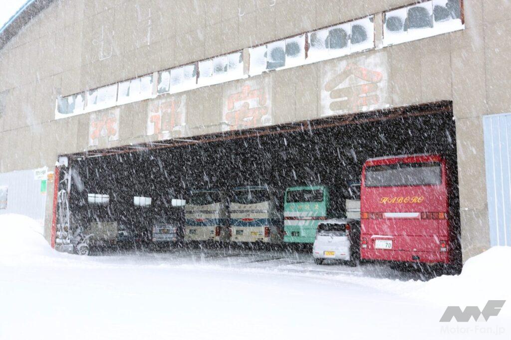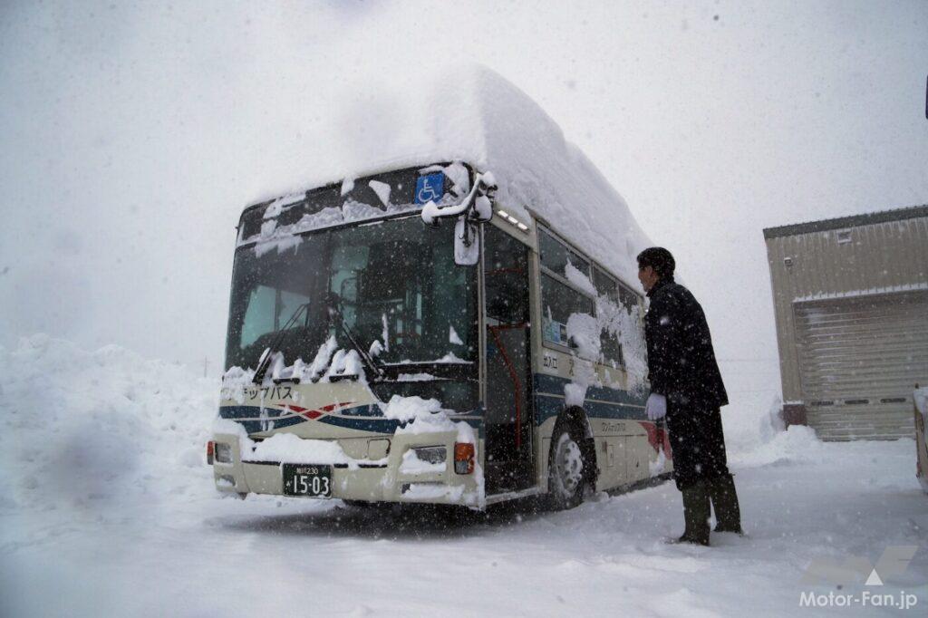 雪に埋もれたバスは1m近くの嵩の雪を乗せていて、それをすべて下ろす必要がある。このまま出庫させれば、走行中に屋根の雪がずり落ち対向車を埋めてしまう危険もあるからだ。乾雪とはいえここまで積もればずっしりと重い。先端にワイパーのようなゴムを取り付けた長いアルミ製の竿で、積もった雪を大型バスの屋根から下ろす作業は重労働だ。1台、また1台。車庫前に居並ぶバスの雪下ろしは、いつ終わるとも知れず続けられる。