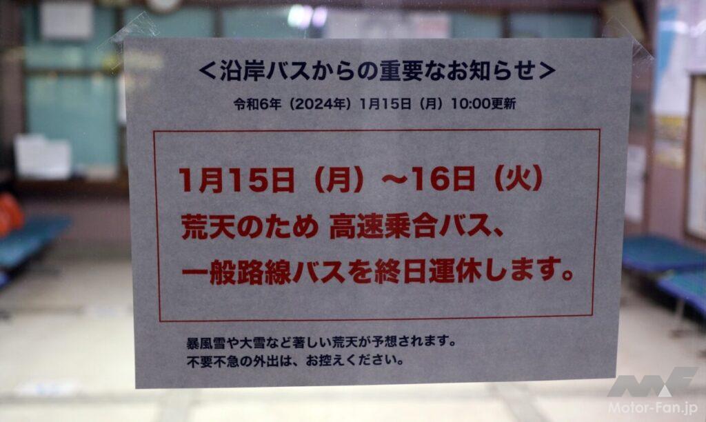 羽幌線羽幌駅跡地の沿岸バス羽幌営業所の中では電話が引きも切らず鳴り、所員は対応に追われていた。その多くは翌朝の札幌行き「はぼろ」号の予約である。都市間バスの予約以外に路線バスの運行を確認する電話も入ってくる。折から1月17日は沿線の高校が新学期を迎える始業式を行なうから、運行の再開は生徒の新たなスタートに必須の条件だった。保護者からの念押しの電話に混じって、留萌市立病院への足を心配する人たちからの電話もかかってくる。年末にもらった薬が切れてしまいどうしても病院に行かなければならない人、バスの運休で16日に予定していた人工透析を受けられず、17日はなにがあっても留萌の病院まで行かないと命に関わるという高齢者もいる。留萌海岸~天塩~サロベツに住む人々にとって、沿岸バスの路線はただひとつの公共交通機関なのである。