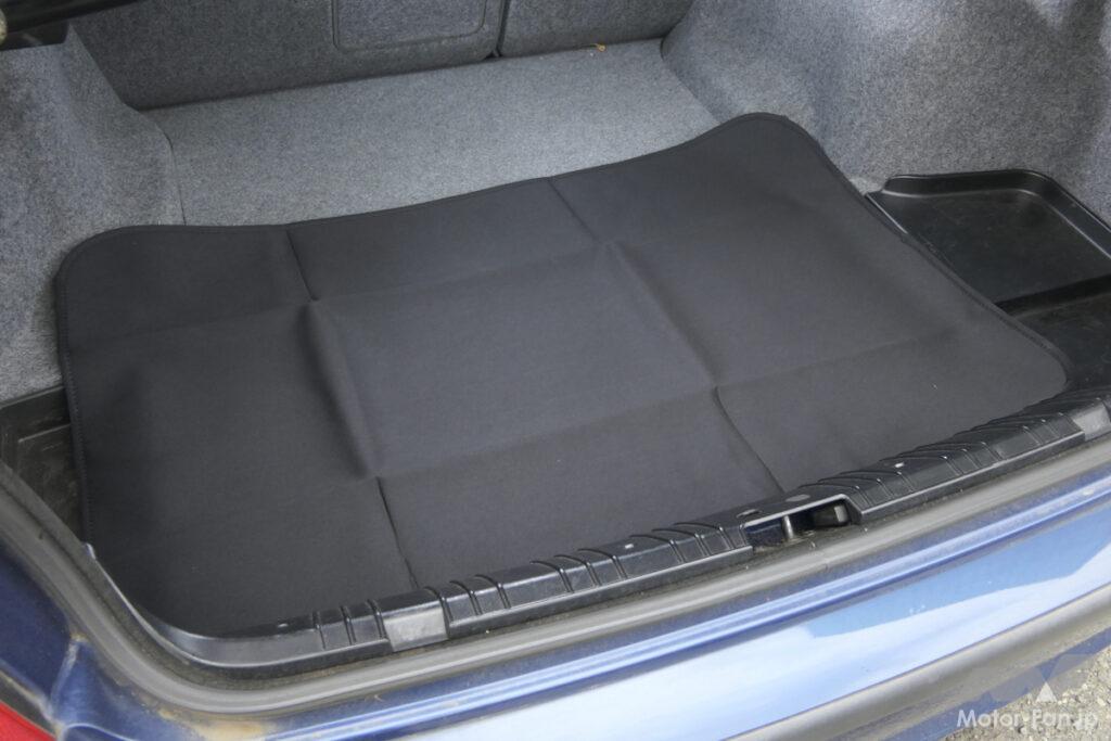 Tomboyの防水ラゲッジマットは、マリンレジャーなどで濡れたものをそのまま置くこともできる。シンプルな一枚モノのマットだが、厚みがあるのでレジャーマットとして使うこともできるのがありがたい。