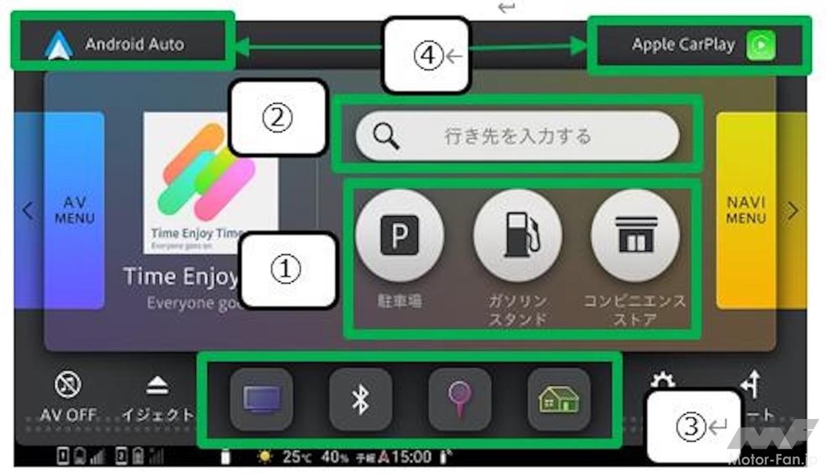 機能面ではインターフェースとして「Doメニュー」を採用。これは、やりたいことを直感的に操作できる画面だ。思いついた言葉を入力するだけで最新スポットも探すことができる「オンライン検索」。ドライブ中によく立ち寄る場所、ガソリンスタンド、駐車場、コンビニをワンタッチで探索可能な「ダイレクト周辺検索」。ガソリンスタンドには、最新のガソリン価格も表示される。そして、よく利用する機能アイコンを4つ配置できる「ショートカットキー」。また画面上にApple CarPlay、Android Autoのキーを配して、いつでも画面を切り替えることもできる。