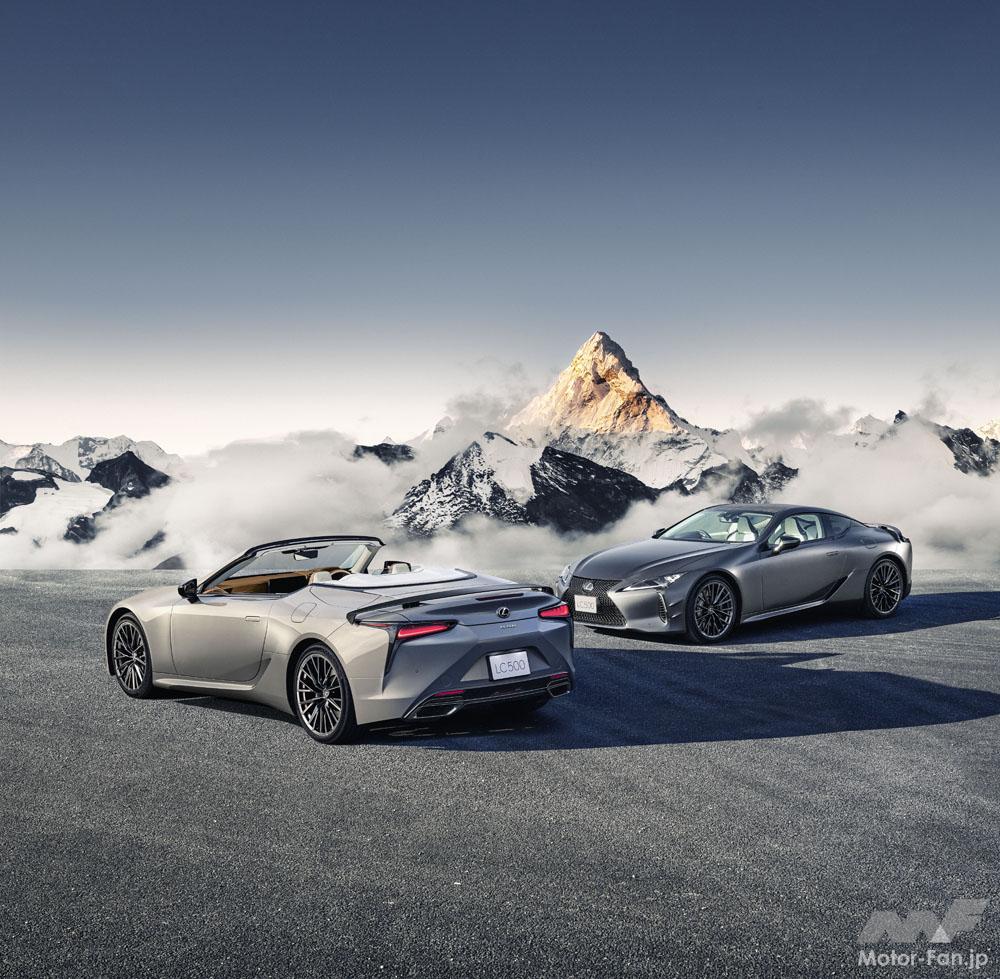 車体色は、LC500“PINNACLE”が、日本古来の金属工芸で銀と銅の合金を仕上げた銀灰色の「朧銀(おぼろぎん)」、LC500 Convertible“PINNACLE”が、硬質なライトソリッドグレーをベースに、ハイライトでメタリックをほのかに感じさせるニュートリノグレーを専用に設定。