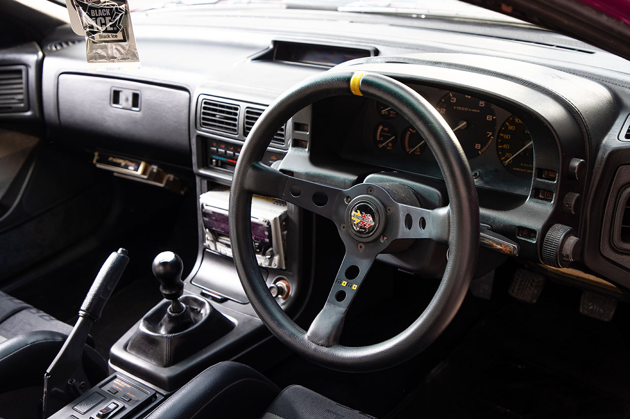 MOMOのステアリングを備えるインテリアも美しさをキープ。ブリッドのフルバケットシートに合わせて、リヤシートやドアも同じトリムで張り替え作業を実施した。レーシングハーネスは同じ群馬県にあるムーンテックのオリジナルアイテムだ。