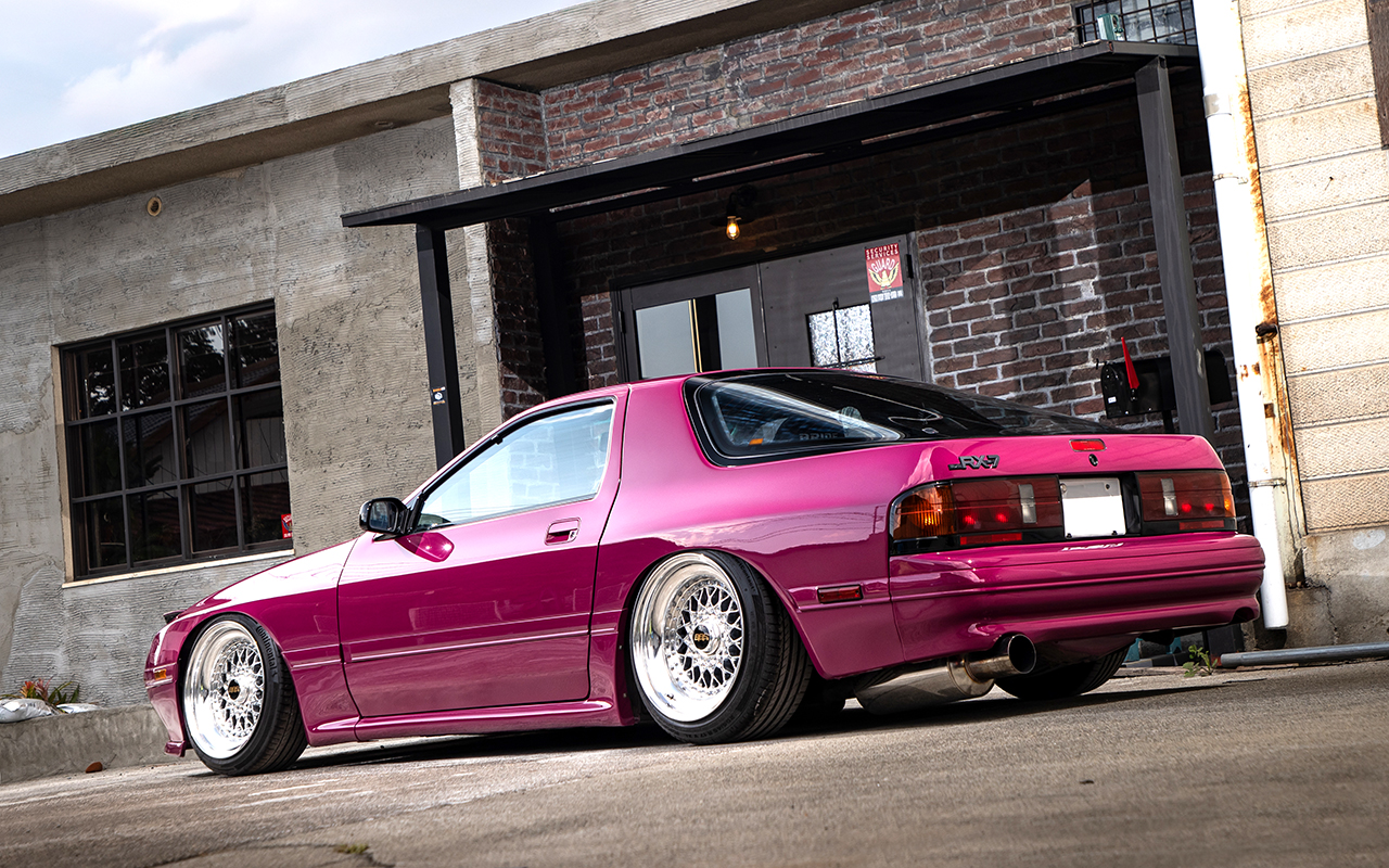 ホイールは東野さんが「どうしてもFCに履かせたかった!」と拘ったBBSのRS。サイズは17インチで深めのダブルステップリムと合わせてバレル研磨。ついつい見入ってしまう足元の美しさを実現した。車高調はTEIN製をチョイス。