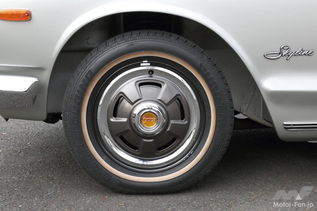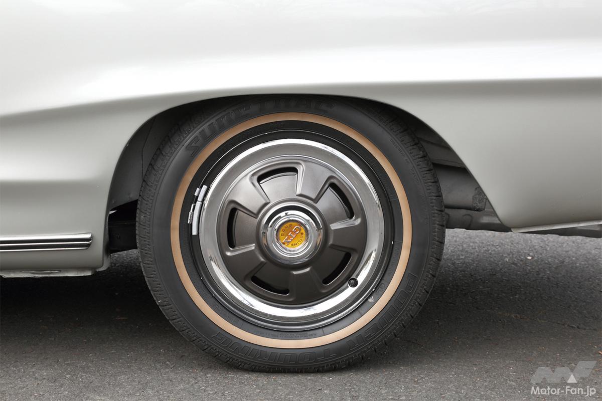 ホイールもホイールキャップも純正をキープ。ちなみに純正鉄ホイールは4.5J-14が標準サイズとなる。組み合わせるタイヤはホワイトリボン。