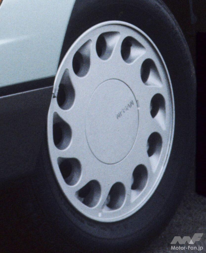 カバーもアルミも、この頃のこのサイズの日産車で使われているものを使いまわしているが、どのクルマにも似合うようにデザインされている。