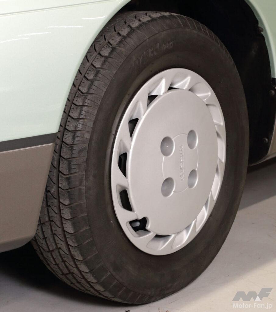 J’sとQ’sには185/70R14と樹脂の14インチ用フルホイールカバーが標準で、ターボ付きK’sには195/60R15と15インチ用カバーが標準となる。