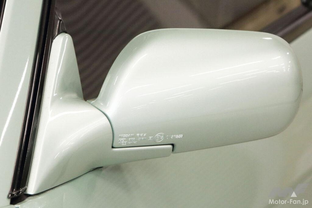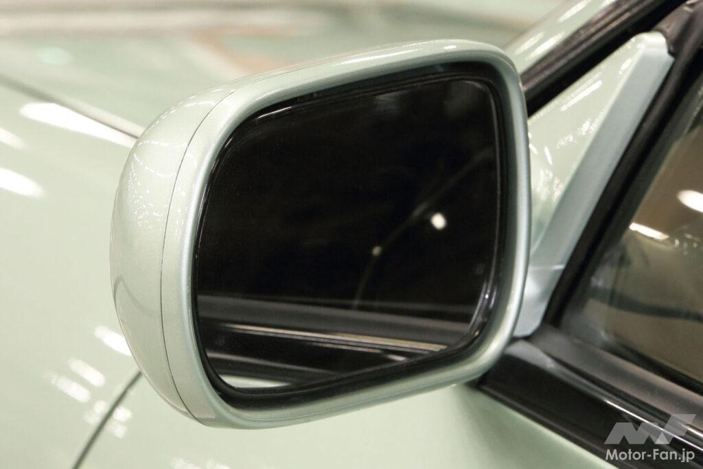 鏡面調整の電動式がQ’sとK’sに標準、J’sは手動式で、いずれも倒し込みは手で行ない、ツートン塗装車はドアミラーがボディ共色となる。
