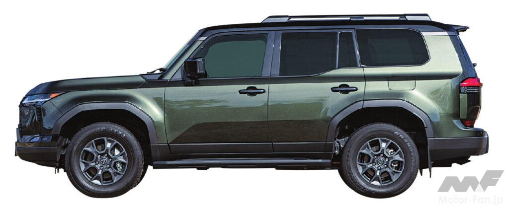 エッジの効いたスクエアフォルムの外装はランクル250と似ている感があるものの、外板はすべて専用。レクサスの品を損なうことなく〝ワイルド〞と〝ゴツさ〞を備えたデザインだ。ボディサイズは全長以外はLXとほぼ同じで、先代比だとサイズアップだが、ドアミラー形状の工夫でミラー・トゥ・ミラーは先代モデルよりも短い上に、見切りの良いボディ形状も相まってリアルな取り回し性はそれほど悪くない。