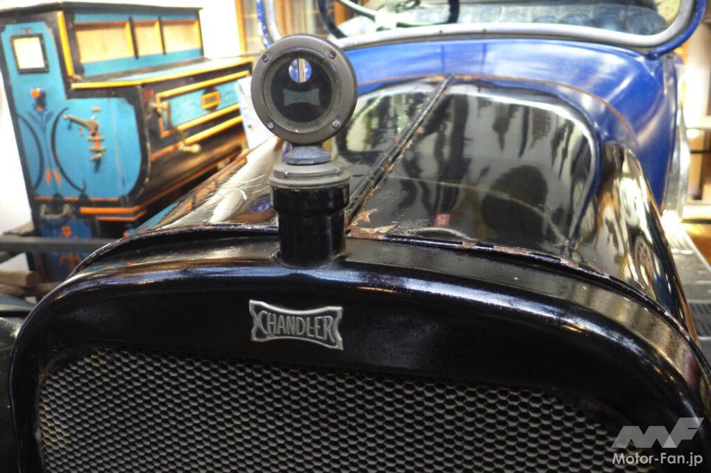さらに奥へ進むと1915年型フォード・モデルT・スピードスターと同年式のチャンドラー・ツーリングが仲良く並んでいた。モデルTについては今さら説明するまでもないだろう。もう1台のチャンドラーは日本国内ではなかなかお目にかかれない。