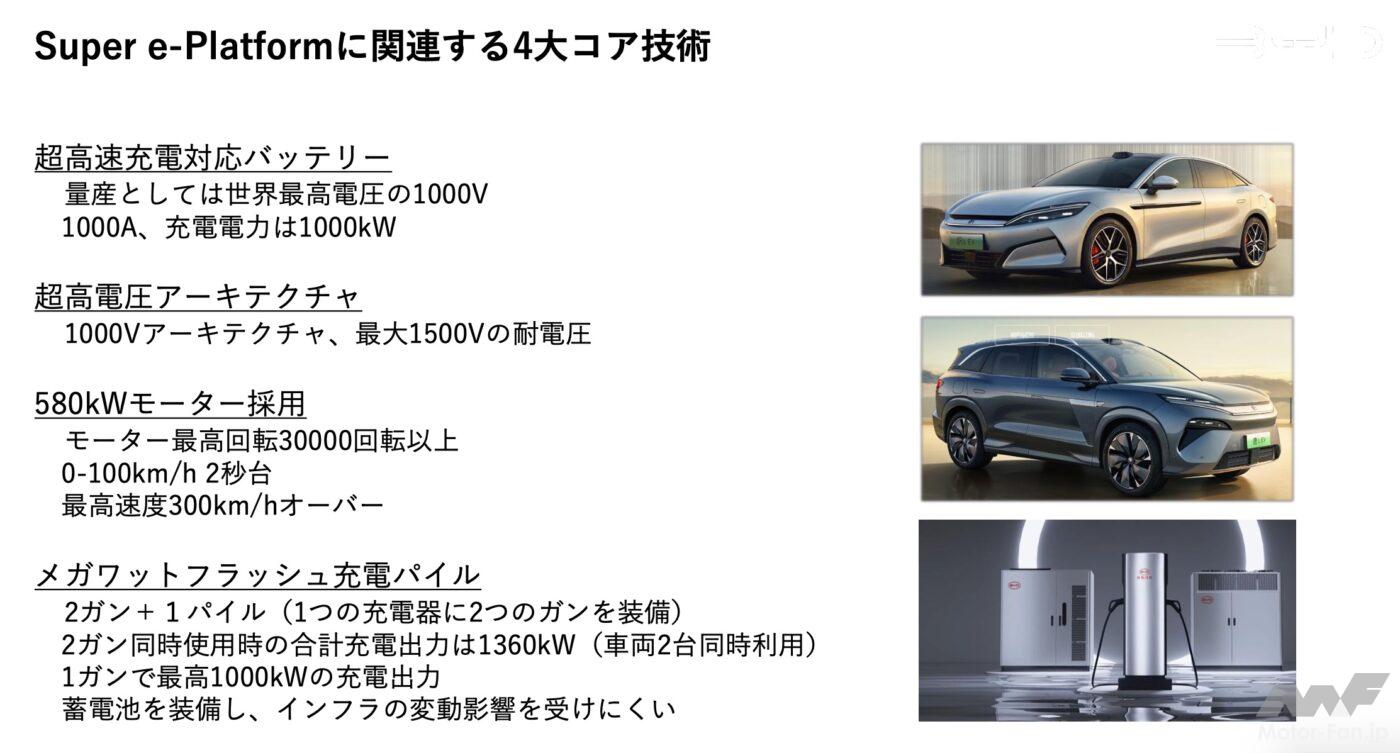 BYDは、2025年3月に内燃機関(ICE)車両の給油時間と同等の急速充電で、同じレベルの航続距離を可能とする「Super e-Platform」技術を発表した。EVの充電速度を大幅に短縮する技術や最高速度300km/h超を達成するという高性能モーターの搭載など、革新技術が多く盛り込まれている。