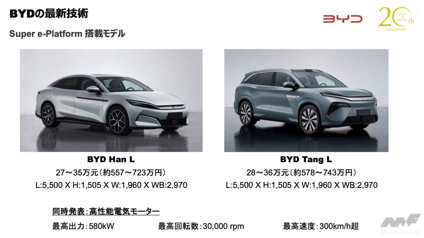 なお、「Super e-Platform」が搭載されるのは、フラッグシップセダンの「BYD Han L」、ラージサイズSUVの「BYD Tang L」の2モデルで、現時点では日本導入はアナウンスされていない。