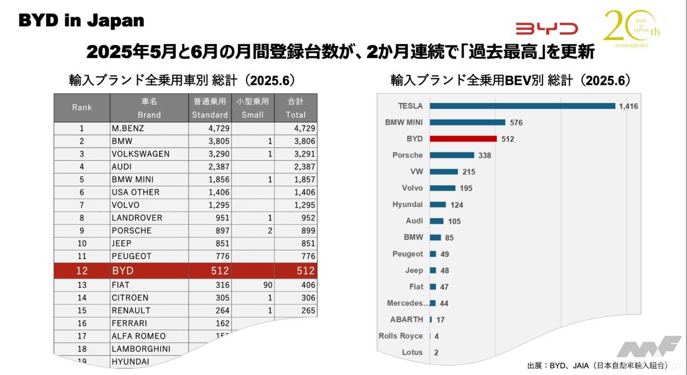 EVの世界販売でテスラと激しい競争を繰り広げているBYDは、お膝元の中国だけでなく、各市場で存在感を示している。日本では、2023年1月から2025年6月末までの間で5305台を登録し、販売網の充実にも余念はない。導入予定の軽EVだけでなく、2025年末にはPHEVの導入も控えていて、より日本市場にマッチしたラインナップとすることで、さらなる拡販を目指している。なお、直近の2025年5月と6月の登録台数は、過去最高を記録していて、輸入車ブランドでは6月は11位。10位のプジョーの背中も見えてきている状況といえるだろう。