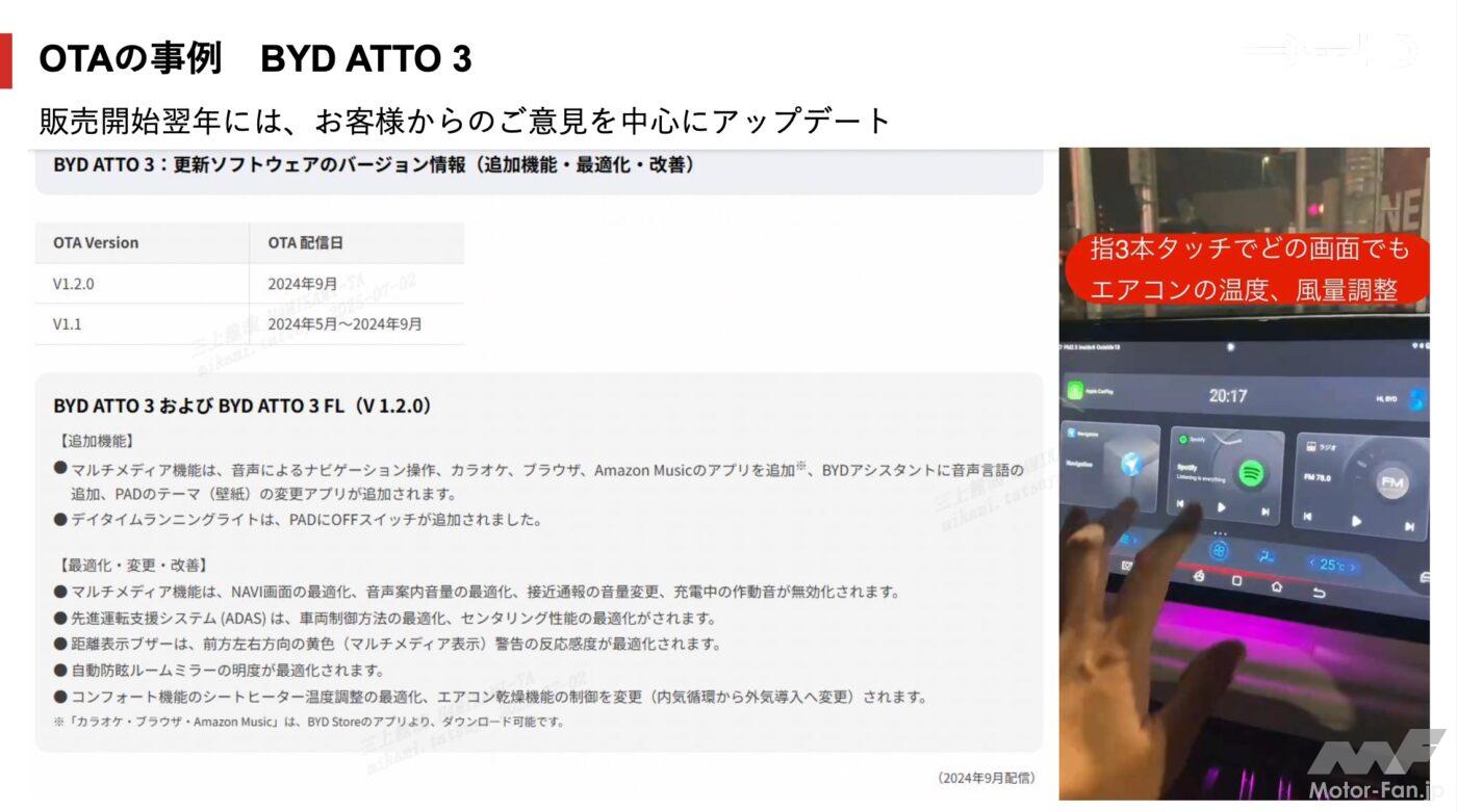 BYDでは、すでにOTAによるアップデートを開始している。たとえば、ATTO3では、販売開始翌年にユーザーからの声に応じて、マルチメディア(インフォテイメントシステム)関連では、「音声によるナビゲーション操作」、「カラオケ」、「ブラウザ」、「Amazon Musicのアプリ追加」、「BYDアシスタントに音声言語の追加」を盛り込んだ。デイタイムランニングライトのマルチメディアコントロールパネル「PAD」にオフスイッチも追加している。指3本で「PAD」をタッチすることで、どの画面でもエアコンの温度や風量設定が可能になるなど、ユーザーならではの声が反映されている。OTAアップデート時には、「PAD」にお知らせ機能を表示する。