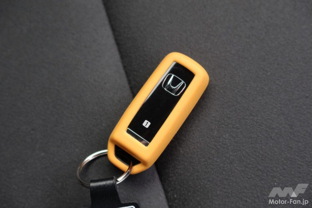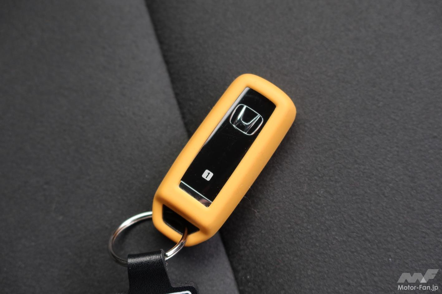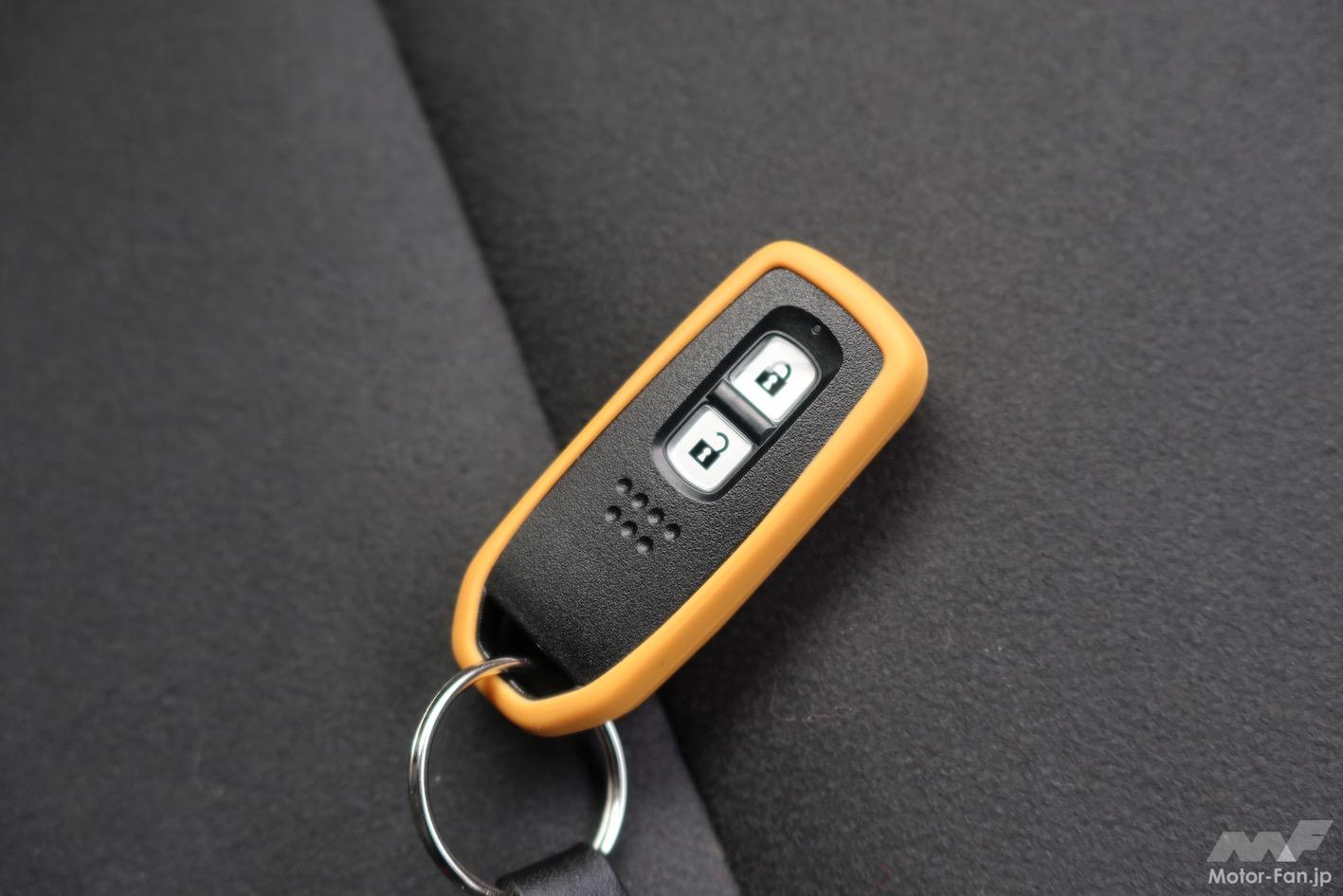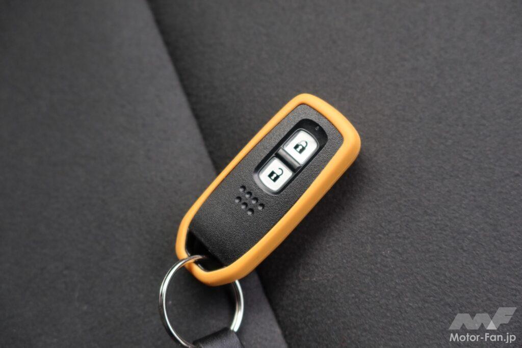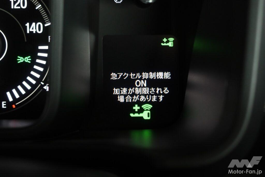 「急アクセル抑制機能」を使用する場合は、納車時に2つ受け取るスマートキーのうち、機能を使用したいほうのスマートキーを販売店で登録(有償)することで使用可能になる。登録したスマートキーで解錠し、エンジンを始動すると、機能が有効になったことがディスプレイに表示される。登録したスマートキーは(写真のように)識別のためにキーカバーの装着を推奨している。