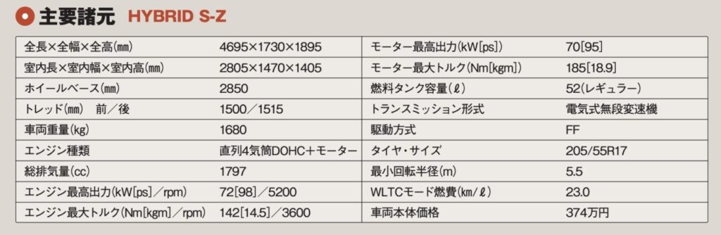 WLTCモード燃費            23.0 ㎞/ℓ ※「HYBRID」系のFF車