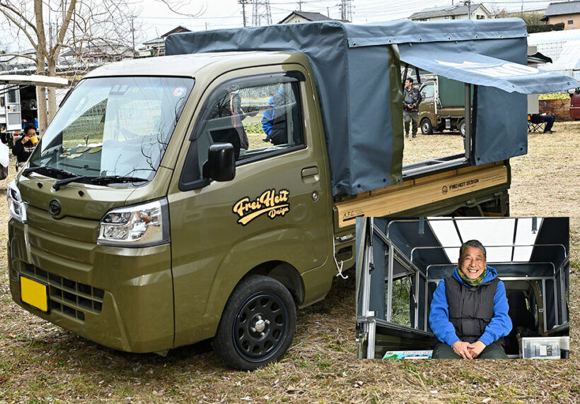 Aプロジェクトのアルミ製品は、この日集まった軽トラキャンパーのオーナー&スペシャリストたちにも大人気。そんなAプロジェクトの重要人物がこの中村さん。この日はシンプルな仕様のハイゼットで来ていたが、幌の天井部分が透明だったのがポイント。とにかく室内が明るかったのだ。取材時に、「今、ジャンボを製作している。荷箱をつけて、背抜きもして…」と話していた。今はもう完成しているころかも!? ぜひ見てみたいモノです。