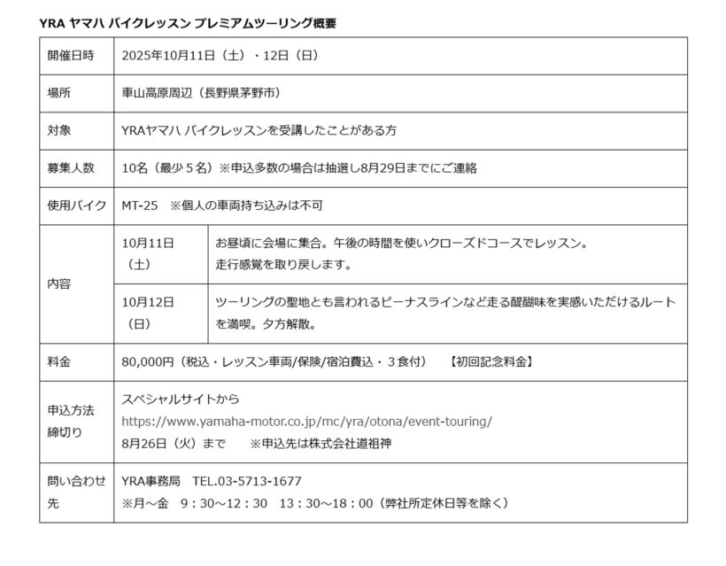 「ヤマハ バイクレッスン」の特別企画プレミアムツーリングが10月11〜12日に車山高原周辺で開催!