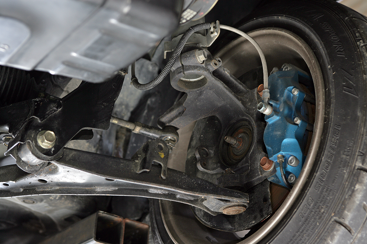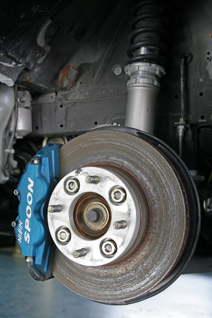 サスペンションはシルクロード製の特注車高調を軸にセットアップ。ブレーキシステムはスプーン製だが、残念ながらロゴ用の設定は無いため他車種用を加工流用した。