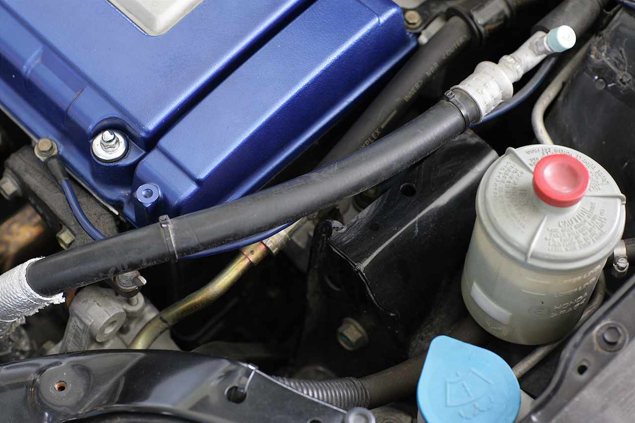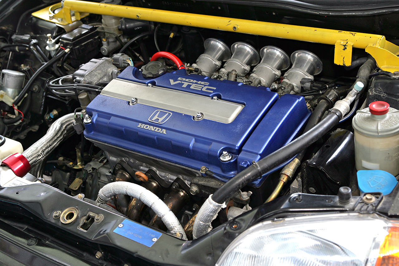 まずエンジンは、DC2インテグラタイプRのB18Cを換装。内部はEK9純正ピストンを流用して圧縮比をアップ。さらに戸田レーシングの4連スロットルやハイカム(300度 12.5mmリフト)を採用し、約250psを絞り出している。