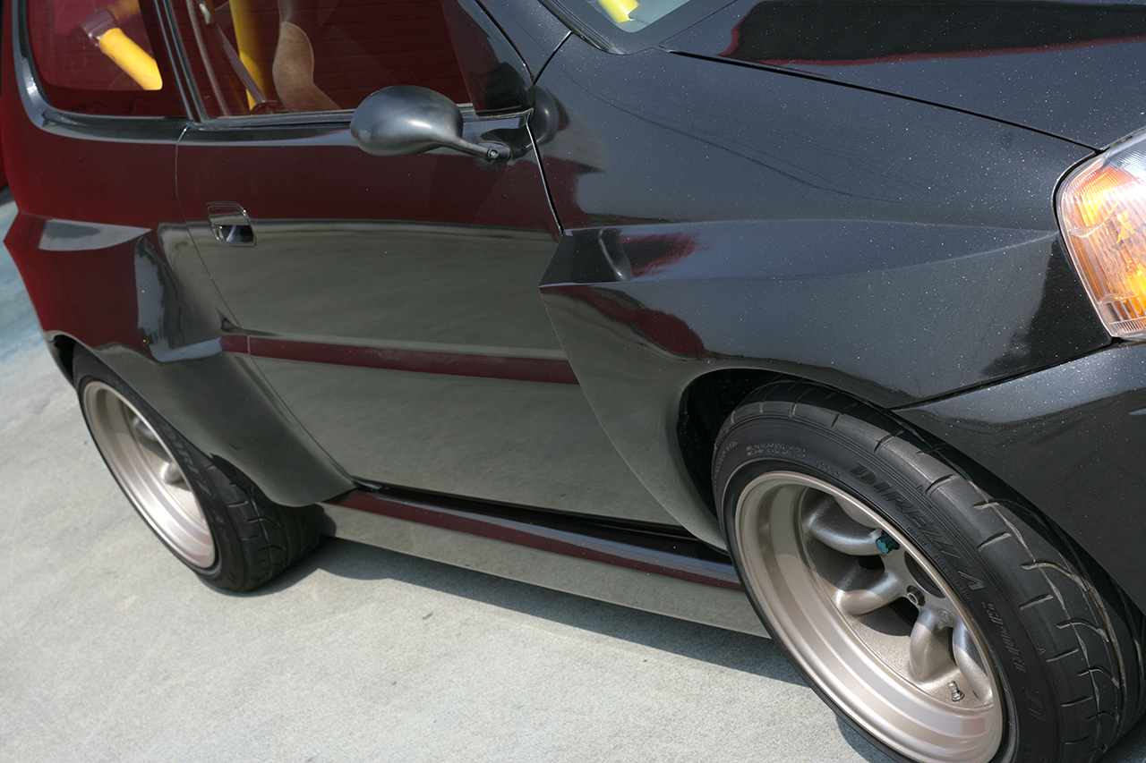 ワンオフブリスターフェンダーにより、全幅は1645mm→約1800mmに拡大。エンジン換装、定員変更などとともに公認申請され、3ナンバーを取得している。