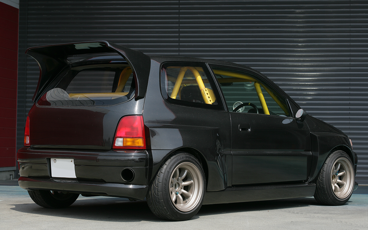 エクステリアもフルで手が入れられている。前後バンパーは純正加工だが、リップスポイラーとサイドステップはロゴ用市販品を延長加工。リヤウイングはスターレット用がベースだ。ボディカラーはトヨタ・サーフの純正ブラックにラメを入れたスペシャルだ。