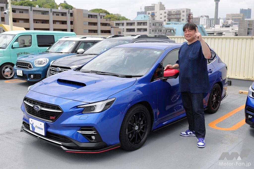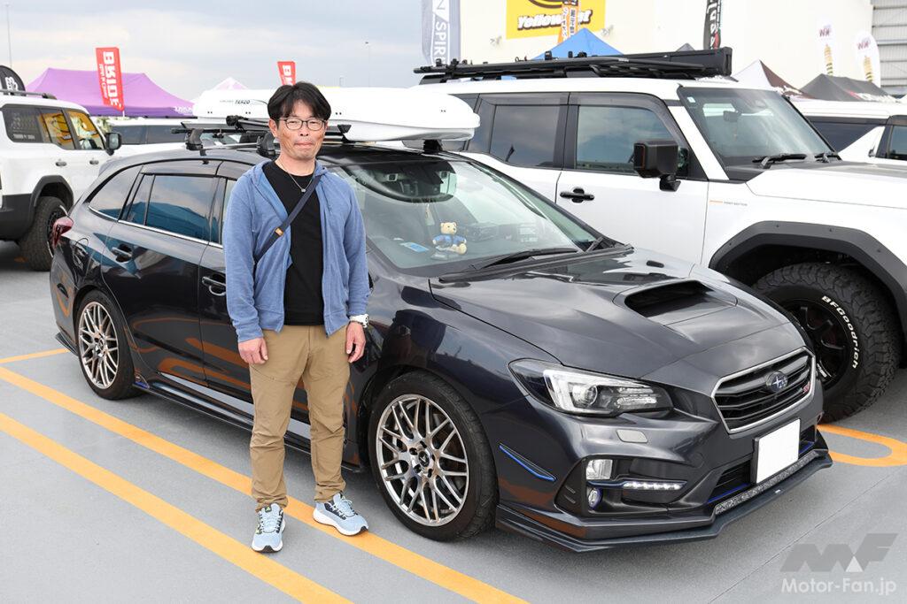 元々エクシーガ乗りだったこともあり、今回はエクシーガ軍団の皆さんと一緒に参加! 現在は今回参加したレヴォーグが愛車ではなく、JB64ジムニー。レヴォーグはエクシーガからの買い替えだが、ジムニー購入時に奥様の愛車になったとのこと。とはいえ、カスタム自体はじみー@Gさんのセンスで仕上げられている。エアロパーツ類はSTIで統一され、シックなボディカラーにマッチするシンプルで控えめな印象。それでも随所にちりばめられたこだわりのアイテムでオリジナリティを演出。STIのバンパーカナードに青ラインを入れたり、フロントバンパーのメッキ部分にフォージドカーボン本加工をしたりと、DIYカスタムも抜かりない。足元はワークのRYVER M009で妖艶な輝きが目を惹く。