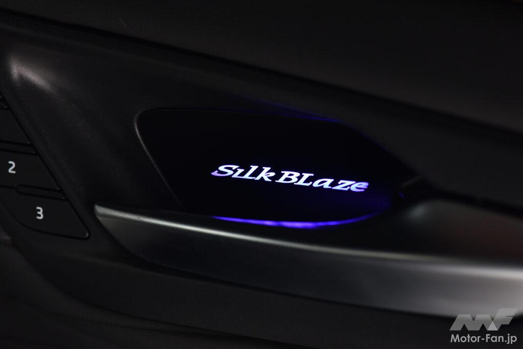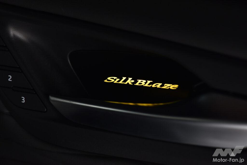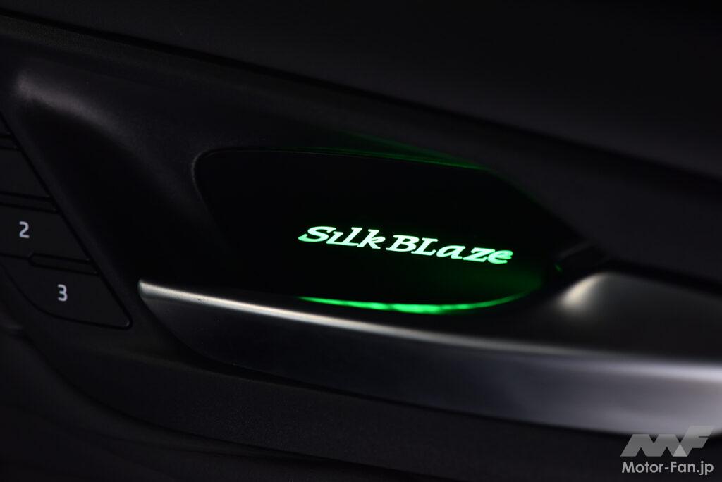 シルクブレイズはドレスアップ性の高いライティングパーツも複数販売しているが、今回対象としたのは、ドア内張りにあるインナードアハンドルだ。見過ごされがちなドアハンドル内でブランドロゴが点灯するアルヴェルにピッタリな新製品で、純正で備わる天井イルミネーションと色味をあわせた全9色から簡単に点灯色を切り替えできる。一定時間ごとに点灯色がゆっくりと変わっていくオーロラ機能も搭載と、空間のムードをグッと高めることができる。設計は当然の40系アルヴェル専用。周囲のパネルとも違和感なくマッチする。