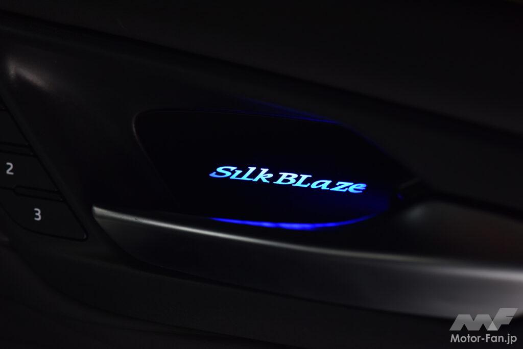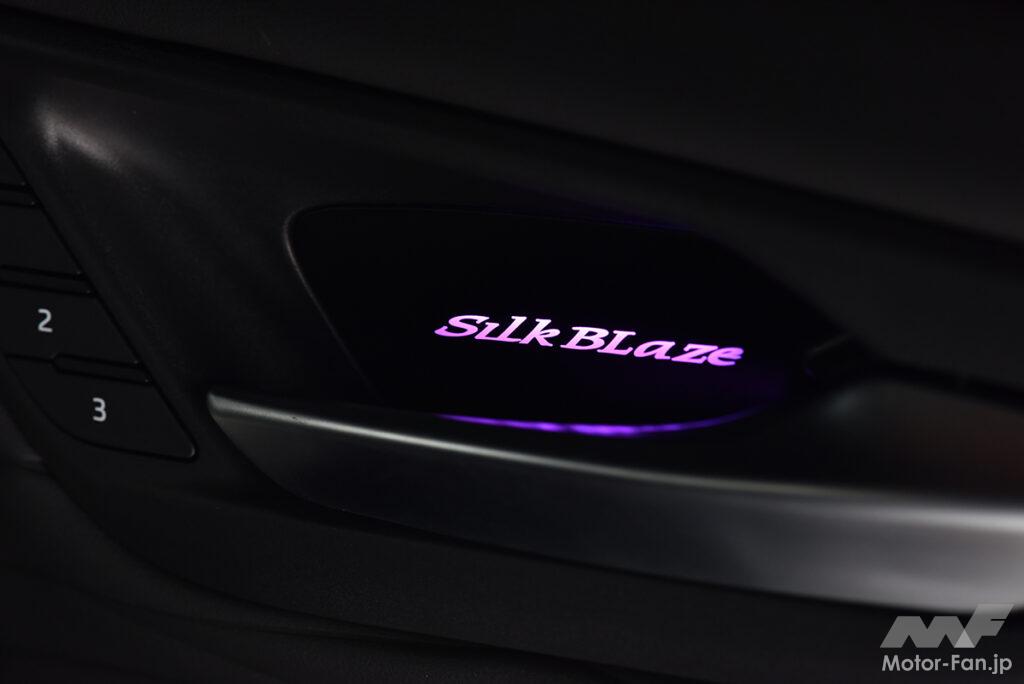 シルクブレイズはドレスアップ性の高いライティングパーツも複数販売しているが、今回対象としたのは、ドア内張りにあるインナードアハンドルだ。見過ごされがちなドアハンドル内でブランドロゴが点灯するアルヴェルにピッタリな新製品で、純正で備わる天井イルミネーションと色味をあわせた全9色から簡単に点灯色を切り替えできる。一定時間ごとに点灯色がゆっくりと変わっていくオーロラ機能も搭載と、空間のムードをグッと高めることができる。設計は当然の40系アルヴェル専用。周囲のパネルとも違和感なくマッチする。