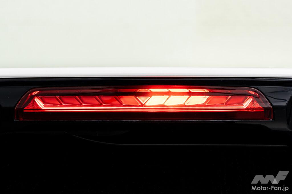 当項で紹介するリップライン付きハイマウントストップランプは、先代である30系でも人気を博したモデルでもある。ポジション点灯時は、シリーズ名の通り矢のようなデザインのセグメントブロック部の発光と、レンズ下段に設けられたリップラインの発光という、2パターンが切り替え可能。また、ウインカーやハザード時はレンズ中央から外側に向けてアンバー光が流れるように点灯し、それだけでなくポジションOKでアピール度も高いオープニングアクションが始動するなど、多彩なライティング機能が楽しめる。