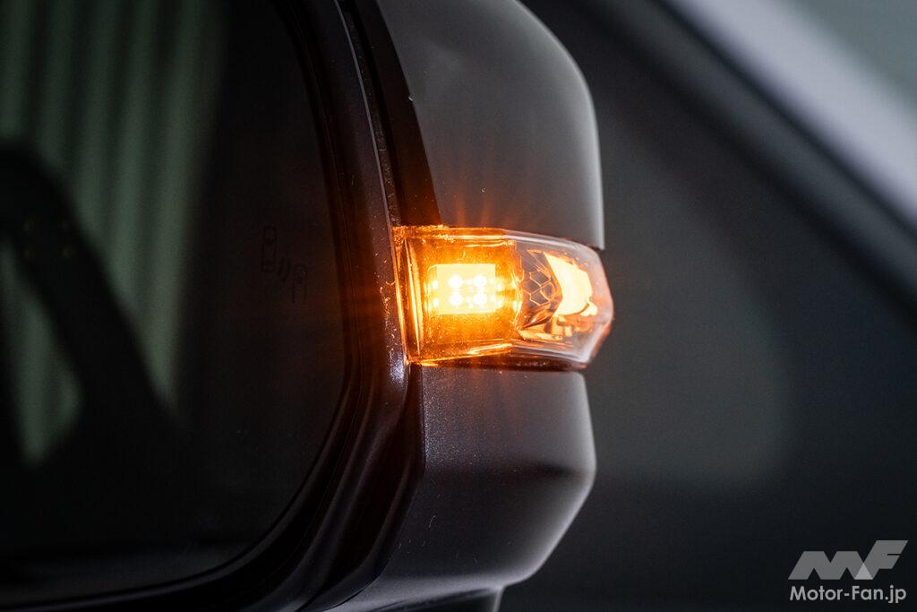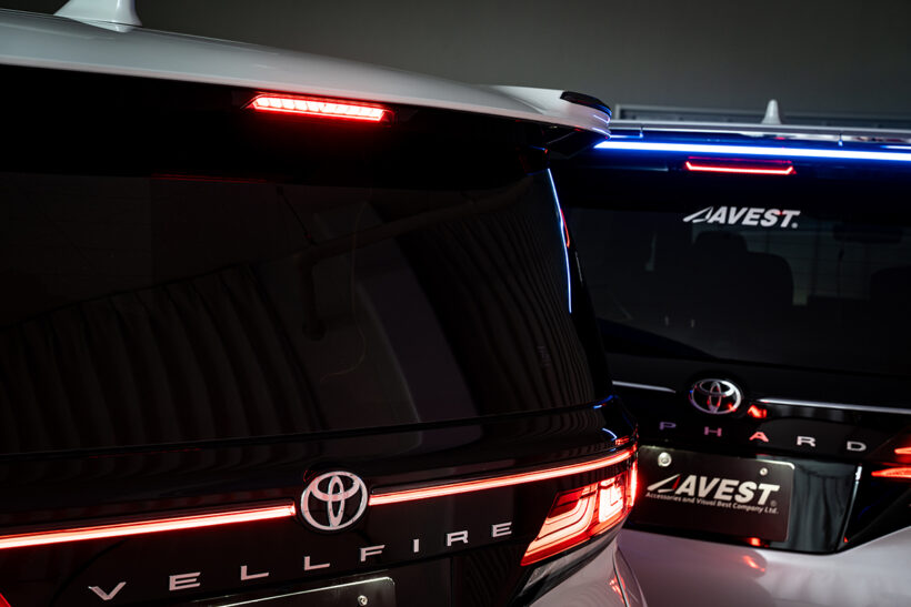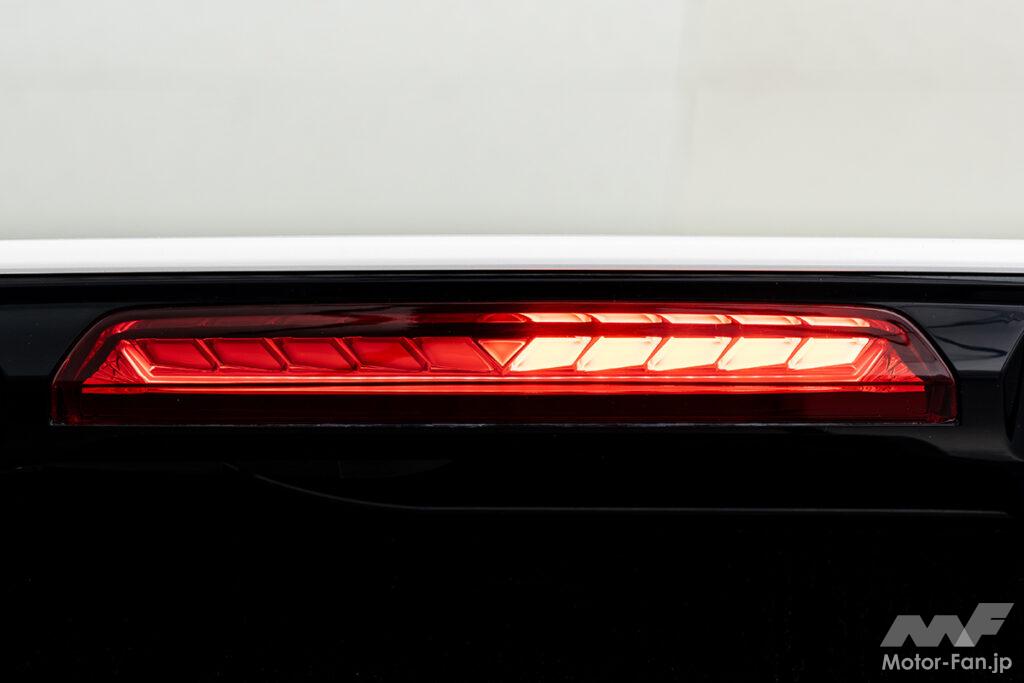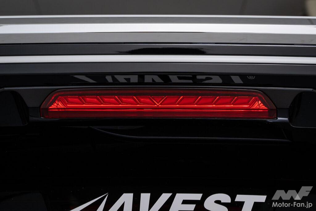 当項で紹介するリップライン付きハイマウントストップランプは、先代である30系でも人気を博したモデルでもある。ポジション点灯時は、シリーズ名の通り矢のようなデザインのセグメントブロック部の発光と、レンズ下段に設けられたリップラインの発光という、2パターンが切り替え可能。また、ウインカーやハザード時はレンズ中央から外側に向けてアンバー光が流れるように点灯し、それだけでなくポジションOKでアピール度も高いオープニングアクションが始動するなど、多彩なライティング機能が楽しめる。