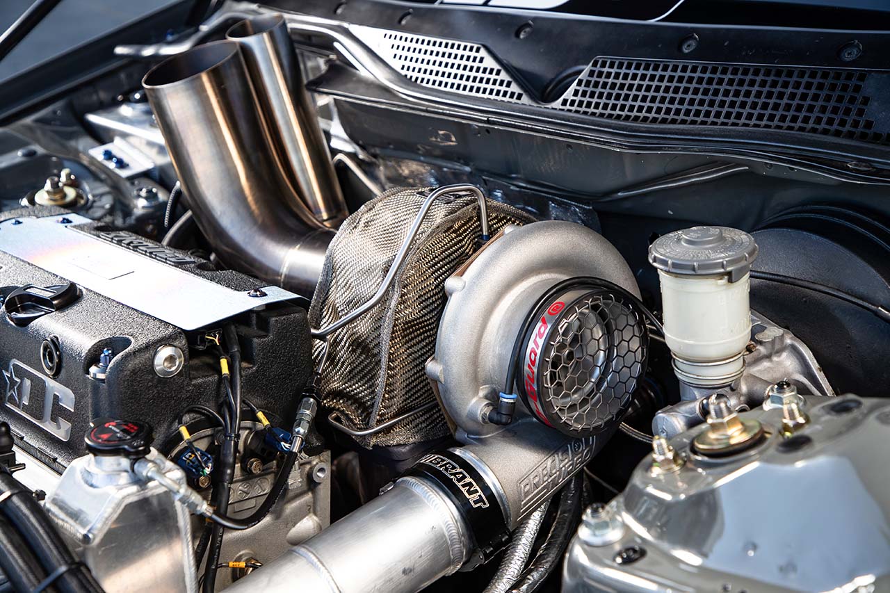 日本仕様のK20A型エンジンをハスポートのマウントを使って搭載。1165psをターゲットにするプレシジョンのGEN2 PT6875タービンを装着し、インタークーラーはR35のチューニングで頭角を表すカリフォルニア州オレンジ郡のワイズクラフトがカスタムメイドした。吸気系にはGatoのインテークマニホールド、K-Tunedの90mmスロットルボディも備え、冷却系にはMEZIEREの電動ウォーターポンプも使用している。ヘッドカバーはK-Tunedとドラッグ・カルテルのダブルネームだ。燃料にはアルコール含有のE85を使用し、フレックスフューエルセンサーの供給元であるAEMのフルコンも使って制御。
