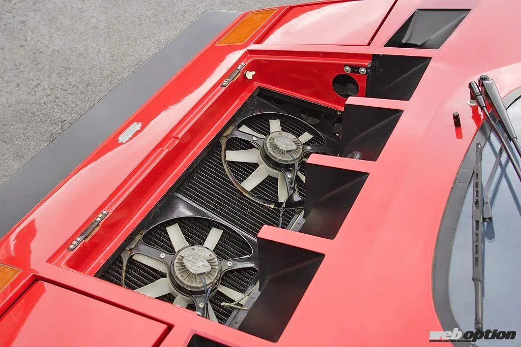 フロントノーズに収められたラジエター。前側を高く、後ろ側を低くセットすることでバンパーの下に流れ込んだ走行風を効率よくコアに導き、2基の電動ファンでボディ上面に引き抜く。ラジエターの上を覆うボディパネルが脱着式とされていたのは意外だった。