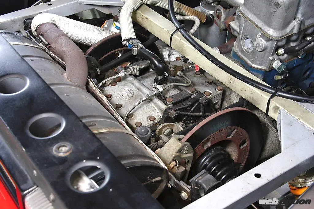 L28の後方にドッキングされたミッションはレース用のZF製5速MT。ブレーキはまさしくレーシングマシンそのもので、ミッションケースのすぐ脇にキャリパー&ディスクローターが配置されるインボード式を採用する。バネ下重量を劇的に軽減する手法だ。