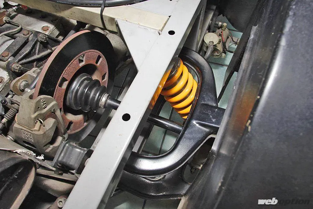 サスペンションは前後ともダブルウィッシュボーン式。ジオメトリー変化が少なく横剛性も確保しやすい…といったメリットを持つことから、レーシングマシンに採用されてきた長い歴史がある。ちなみに、今時のマルチリンク式はその発展型と言っていい。
