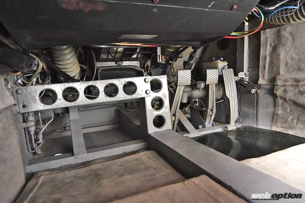 アクセルペダルはオルガン式、相当な踏力が必要とされるブレーキ&クラッチペダルはフロアからはえる。タイヤハウスが左右に食い込んでくるため、ノーズに向かってフロアの幅が絞られているが、足元のスペース的な問題を感じることはない。