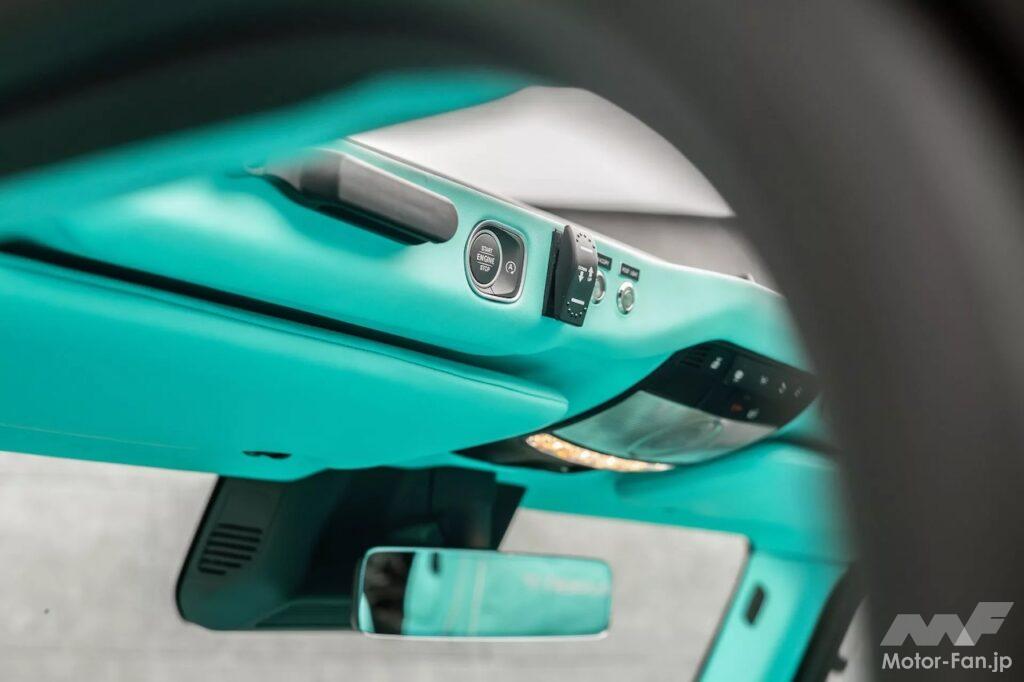 そしてキャビン。鮮やかなターコイズブルーのレザーに、ホワイトのパイピングとアクセントがあしらわれている。さらに、緑、水色、黄色、紫の不揃いなシートベルト、カスタムペイントされたエアベント、そしてモノポリーのアート作品の数々が散りばめられているのも特徴だ。