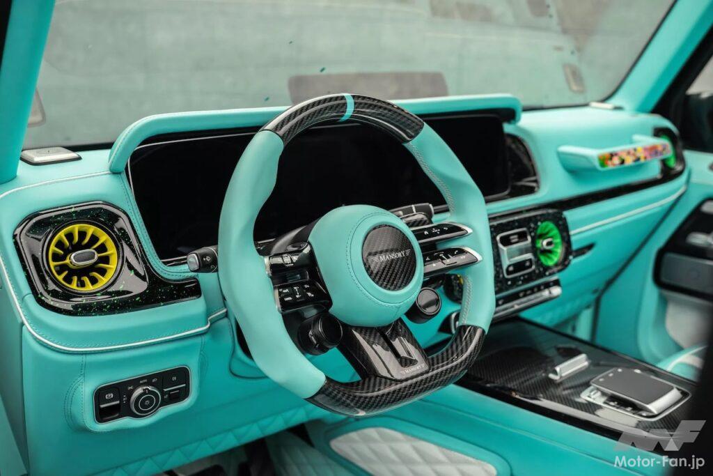 大幅に改造されたGクラスには、外装全体に鍛造パーツをはじめ、カーボンファイバーがふんだんに使用しているほか、外装をペイントし、ワイルドなインテリアをカスタマイズしている。